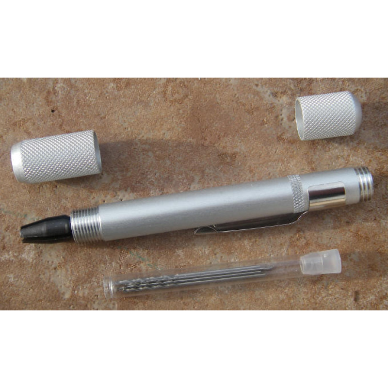 Vrtáky ve schráně uvnitř vrtačky nejsou volně nasypané, ale jsou uloženy v plastové tubě. Tím pádem se jich ovšem dovnitř vejde podstatně méně než u předchozího typu. Šest vybraných vrtáků je k vrtačce přiloženo z výroby, do schránky se jich může vejít i více, záleží na průměru. Schránka se uzavírá šroubovacím víčkem.