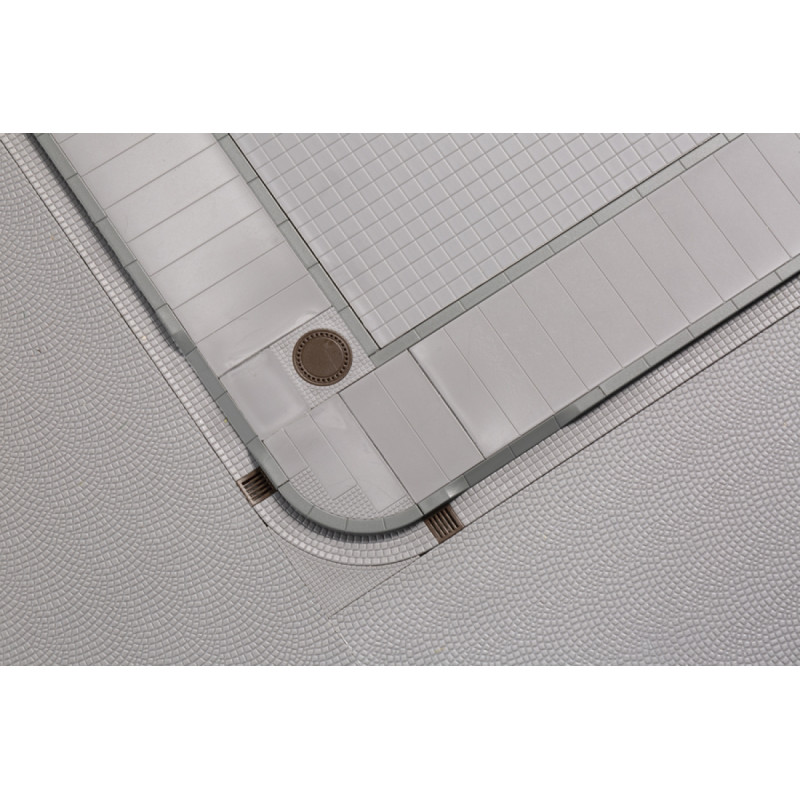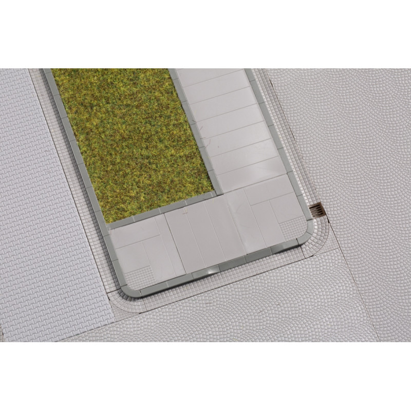 Chodníkové desky jsou vhodné pro obrubníky a žlaby 42656. Speciální rohové kusy pro různé poloměry usnadňují stavbu dle předlohy. Modulární systém doplňují panely s úchyty pro uzavřené vtokové a průlezové poklopy a perforované prvky pro jednotlivé sloupy s pouličními světly.