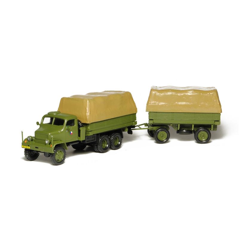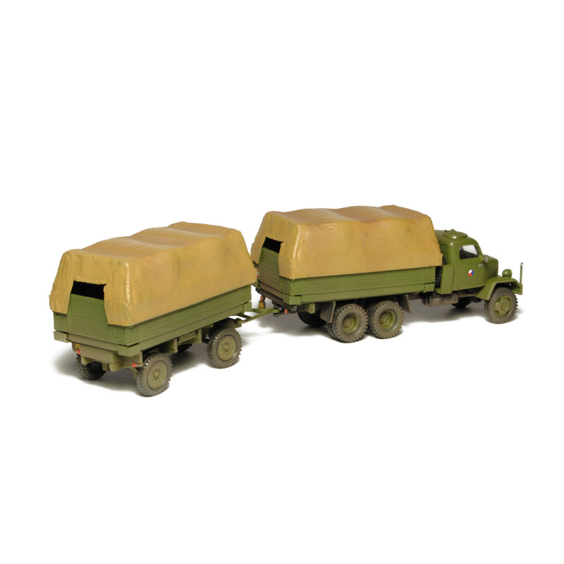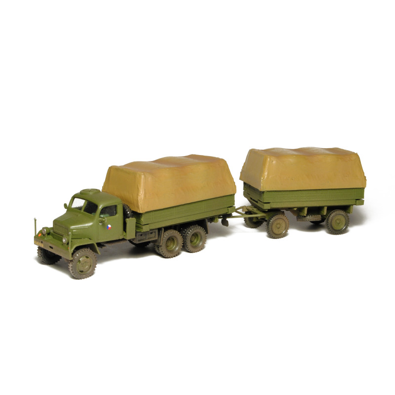 Kompletní plastiková stavebnice vojenského valníku s přívěsem. Obsahuje probarvené plastikové výlisky na sestavení modelů, kovové osičky a sadu obtisků ČSLA, AČR a ASR.