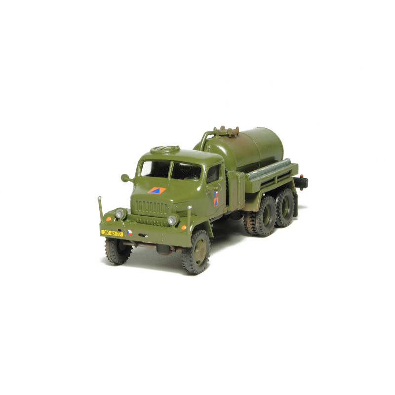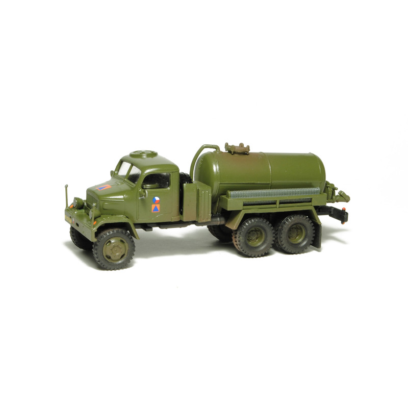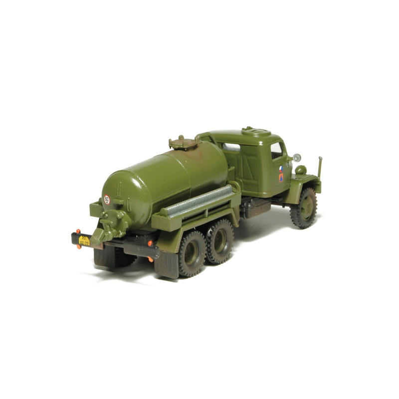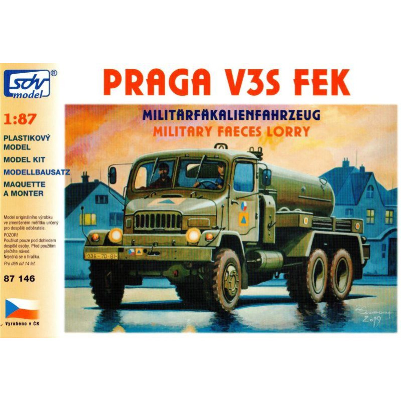 Kompletní plastiková stavebnice vojenského fekálního automobilu. Obsahuje probarvené plastikové výlisky na sestavení modelu, kovové osičky a sadu obtisků.