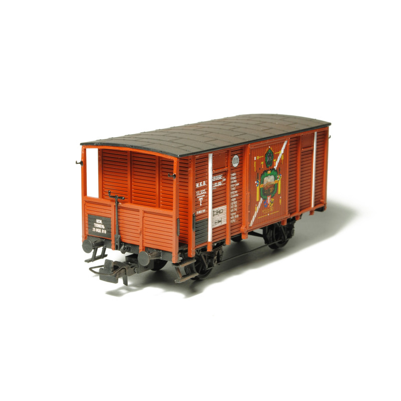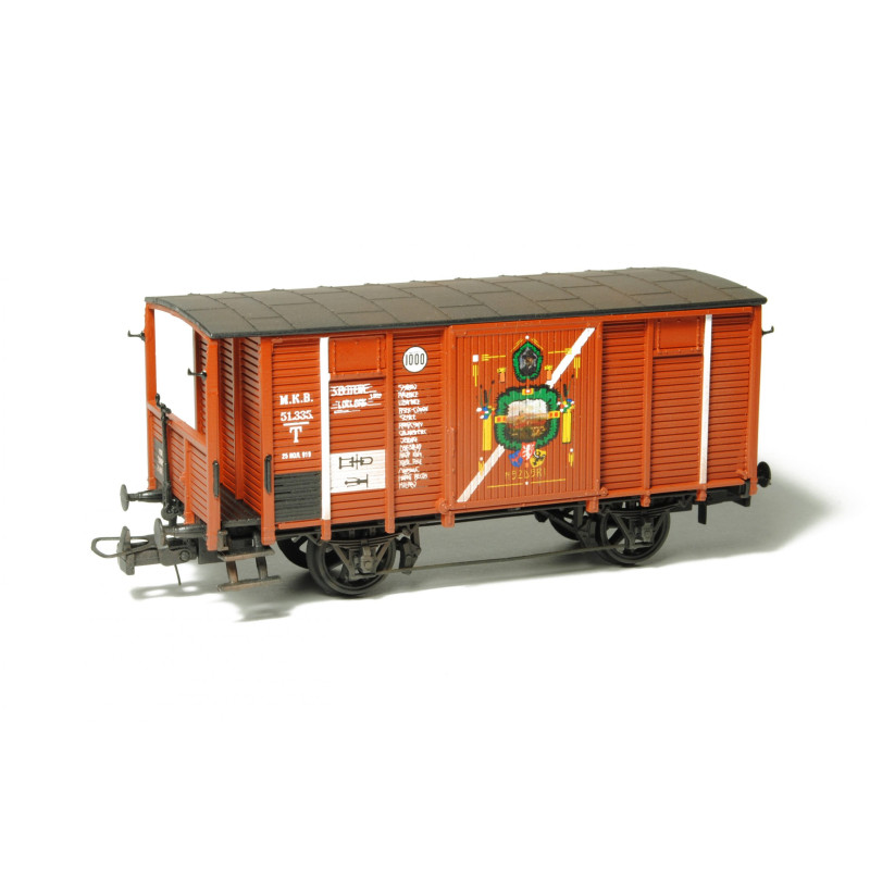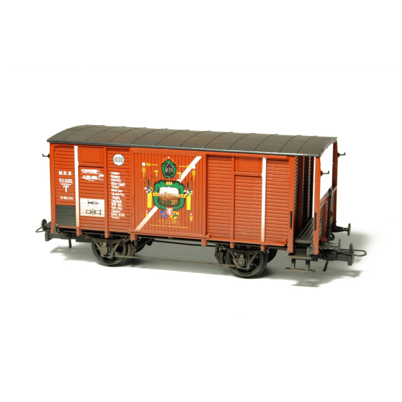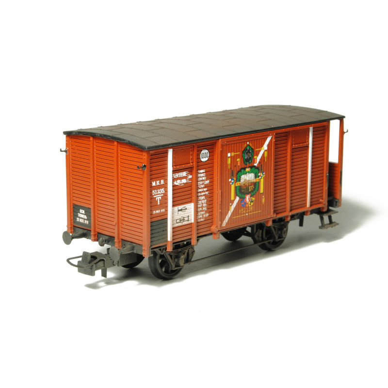 Kompletní plastiková stavebnice železničního vozu typu HTB Československých legií působících v Rusku – Tepluška, tedy vůz pro přepravu mužstva. Obsahuje probarvené plastikové výlisky na sestavení modelu včetně kinematik, spřáhel a loukoťových dvojkolí, kovové lepty, závaží a obtisky.