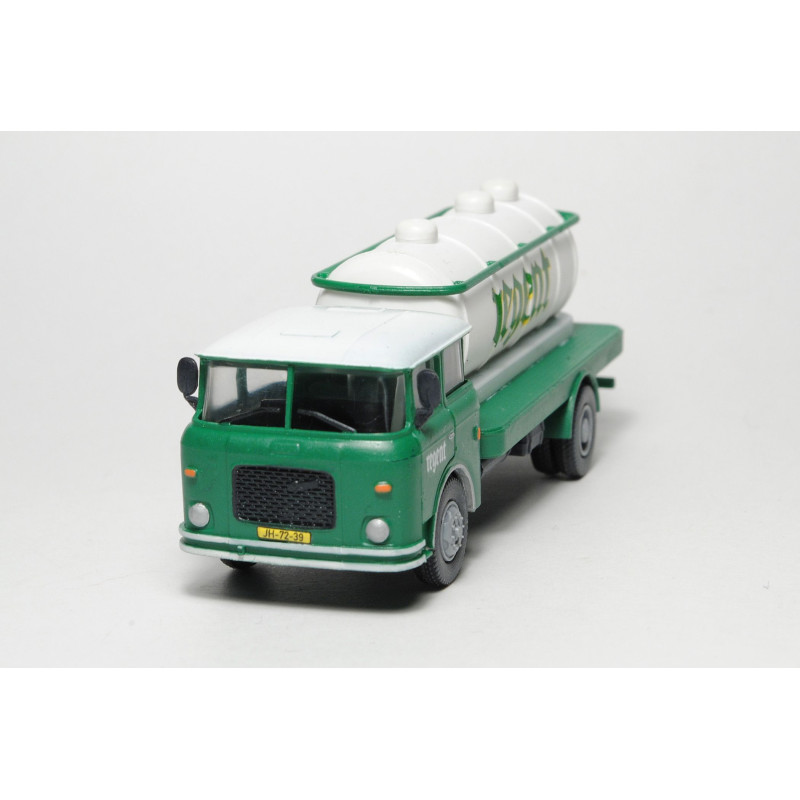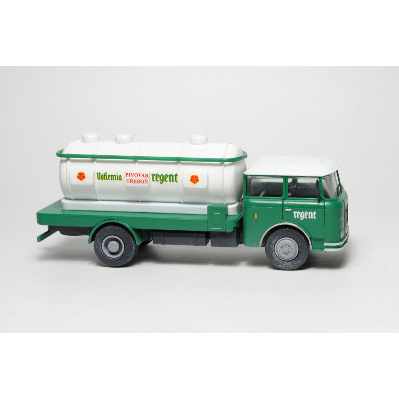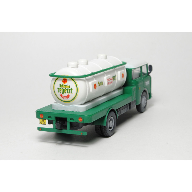 Kompletní plastiková stavebnice automobilu pro převoz piva. Obsahuje probarvené plastikové výlisky na sestavení modelu, kovové osičky a sadu obtisků.