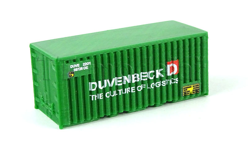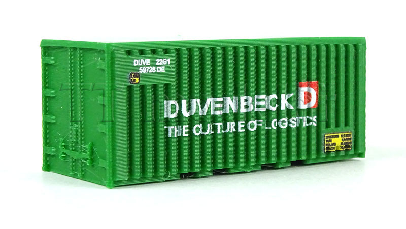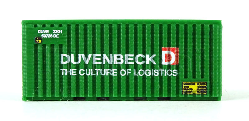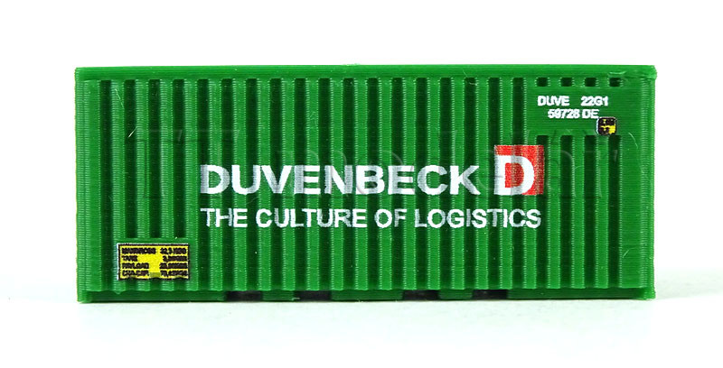 Model 20stopého lodního kontejneru DUVENBECK – THE CULTURE OF LOGISTICS. Vyrobeno z plastu, potisknuto kvalitním UV tiskem s rozlišením 0,8 mm.