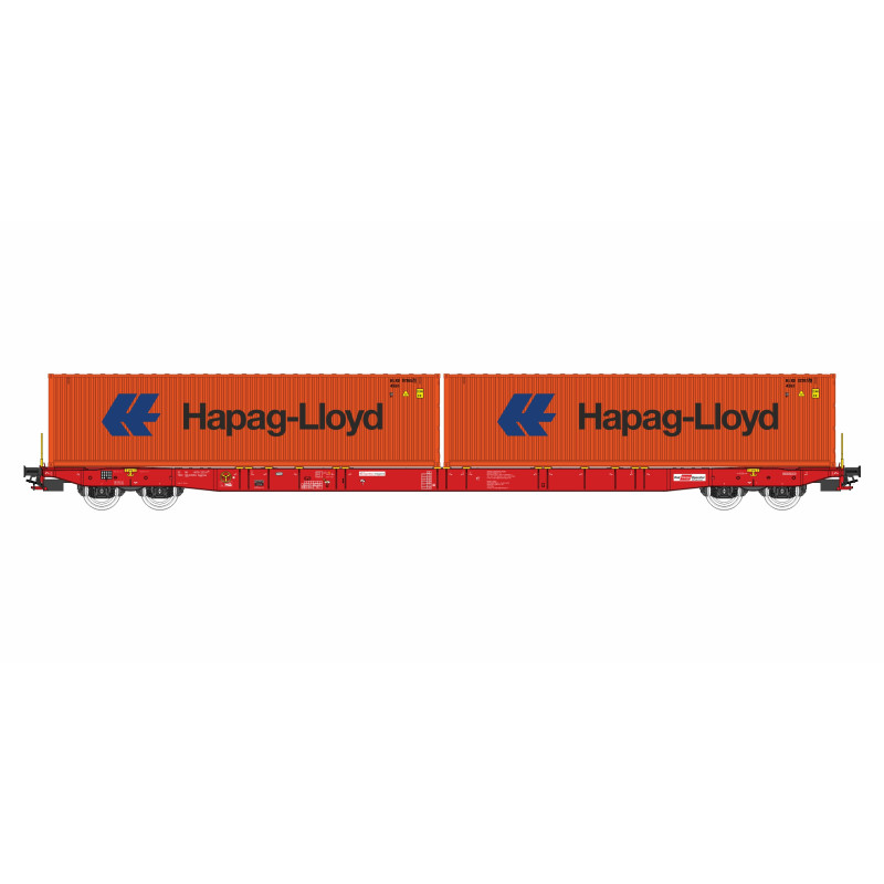 4osý 80stopý kontejnerový vůz. Ložený dvěma 40stopými kontejnery s vnitřní zátěží pro optimalizaci jízdních vlastností. Se dvěma kontejnery Hapag Lloyd.