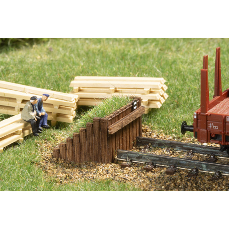 Hotový model zarážedla z dřevěných prken. Velmi jemně strukturovaná dřevěná prkna modelu jsou laserována z pravého dřeva. Přiložena deska "Konec kusé koleje". Lze použít od I. epochy.