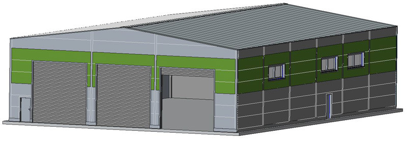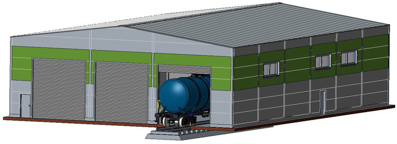 Průmyslová, plechová hala s vraty pro vjezd kolejových nebo silničních vozidel. Vrata lze zkompletovat otevřená nebo zavřená. Stavebnice LaserCut.