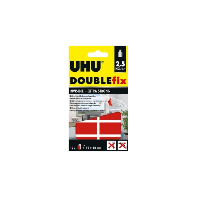 Lepené díly musí být čisté, suché a odmaštěné. Též odprášené - musí mít pevný podklad. Minimální teplota při lepení je 10°C. Jednu stranu pásky přitiskněte na lepený předmět. Pokud je předmět těžší, než 2,5 kg, použijte více dílků - vzdálenost mezi dílky 3-5 cm. Potom odstraňte ochranný film a přitlačte druhý lepený díl po dobu alespoň 5 sekund. Plná funkční pevnost spoje je dosažena po 24 hodinách. Pevnost spoje závisí od velikosti plochy pásky UHU DOUBLEfix.