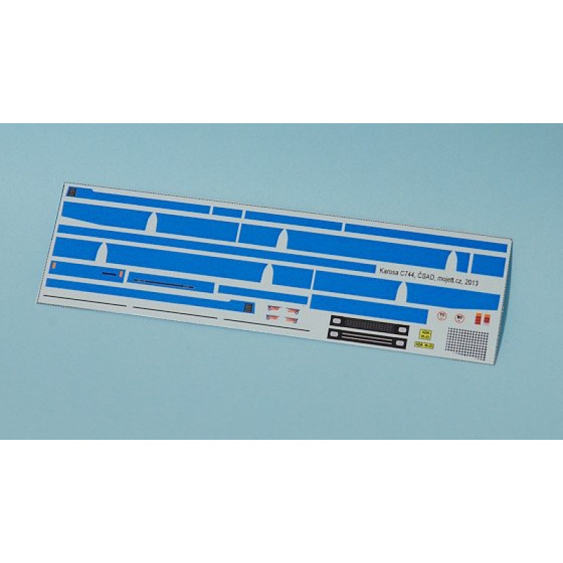 Obtisková sada modrých pruhů pro linkovou Karosu C744 v provedení ČSAD. Lze použít od epochy IV až po epochu VI. Obsahuje vše potřebné pro obtisknutí bíle nastříkaného modelu včetně obtisku na nárazníky. Po osazení obtisků je vhodné černou barvou natřít gumy na předním a zadním nárazníku a výfuk. Pod přední SPZ je třeba vytvořit opět bílý podklad (například natřít bílou barvou po obtisknutí modrého nárazníku).