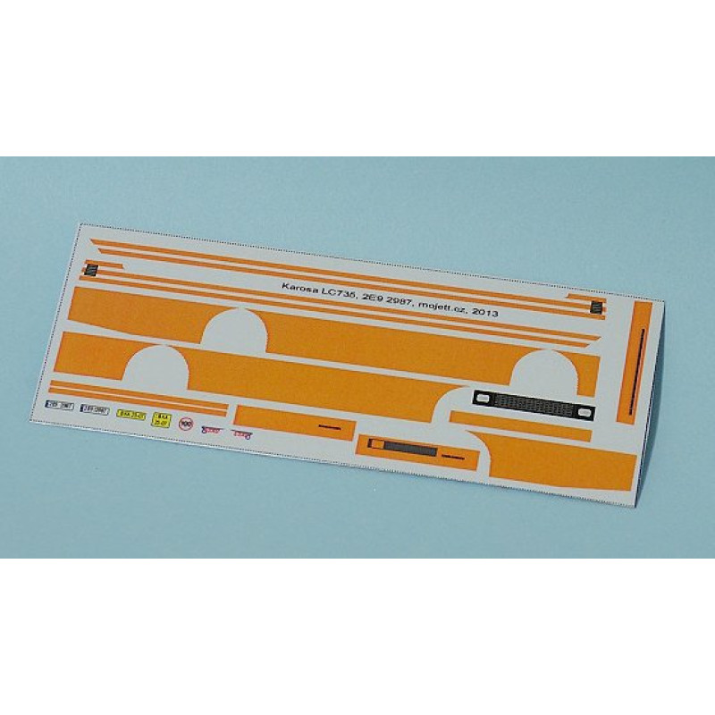 Obtisková sada oranžových pruhů pro dálkovou Karosu LC736 v expresním provedení ČSAD (horní pruh složen z více úzkých pruhů). Lze použít od epochy IV až po epochu VI. Dva druhy přední masky (s krytem nádechů nebo bez) a dva druhy SPZ (starší žluté a novější s EU proužkem). Sada obsahuje vše potřebné pro obtisknutí bíle nastříkaného modelu včetně obtisku na nárazníky. Po osazení obtisků je vhodné černou barvou natřít gumy na předním a zadním nárazníku a výfuk. Pod přední SPZ je třeba vytvořit opět bílý podklad (například natřít bílou barvou po obtisknutí oranžového nárazníku).