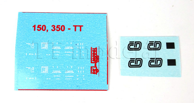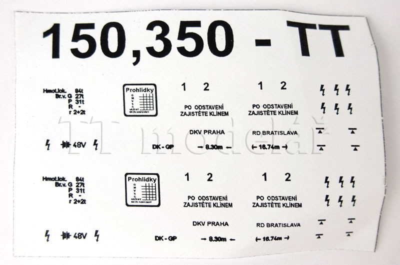 Popisy formou obtisků pro loko Banán, Gorila, tedy 150 a 350, DKV Praha, RD Bratislava, součástí jsou i loga ČD,