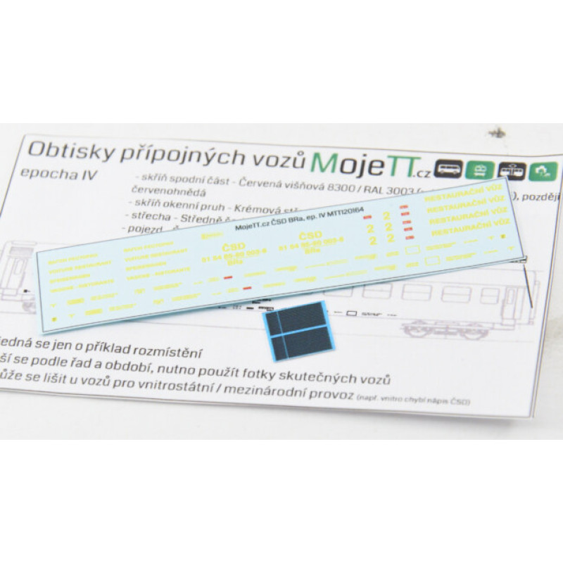 Obtisk osobního vozu s jídelním oddílem BRa. V roce 1969 byly ve Studénce vyrobené 4 vozy pro běžné vlaky vedené lokomotivou. Vozy jsou kromě brzdové výstroje a způsobu vytápění shodné s vozy BRam (pro motorové rychlíky). Vozy BRa byly dodány se zelenou skříní, střecha šedá střední. V provozu pouze během 70. let na mezinárodních i vnitrostátních rychlících. Na konci 70. let všechny vozy přešly např. jako obytné pod TSS a EŽ. Sada obsahuje obtisk 2 ks mřížky na střechu vozu.