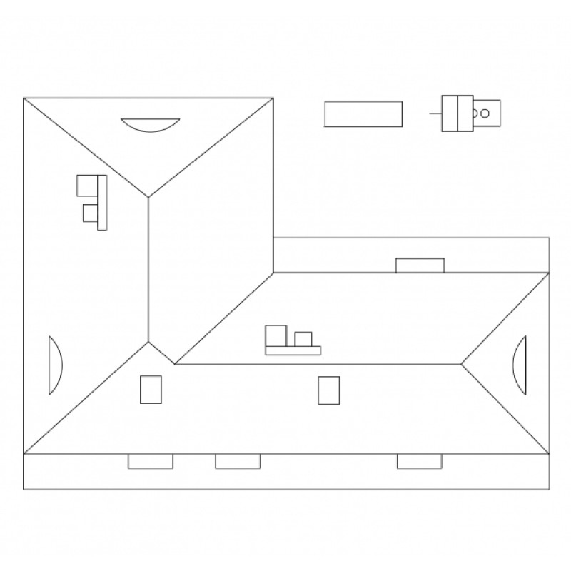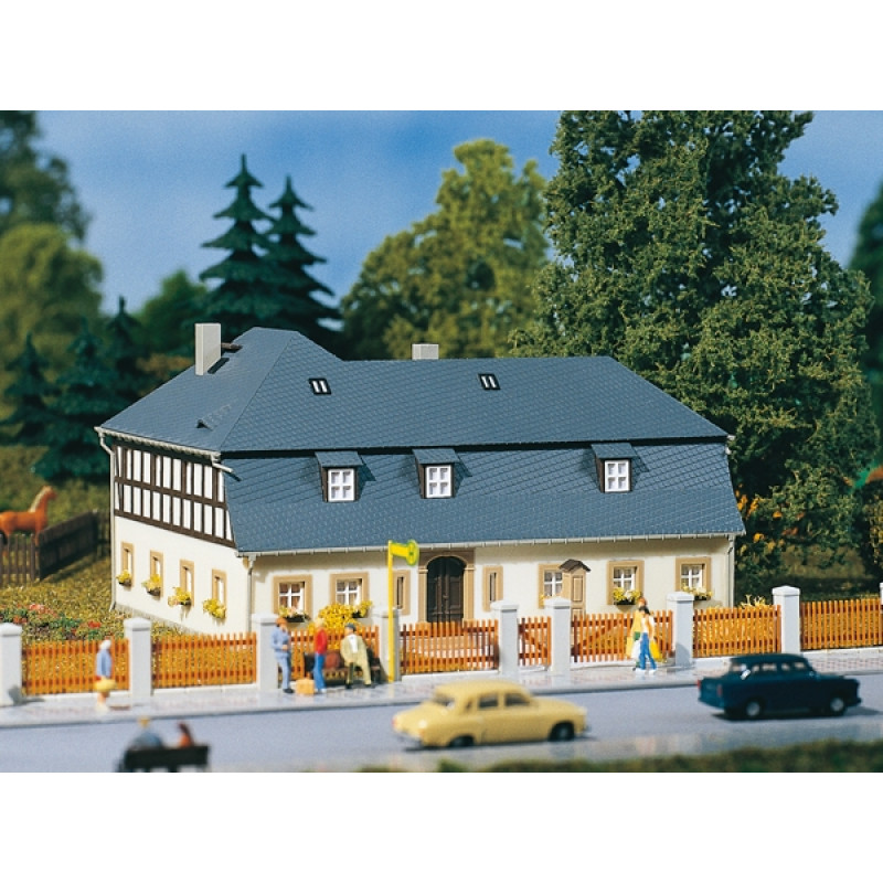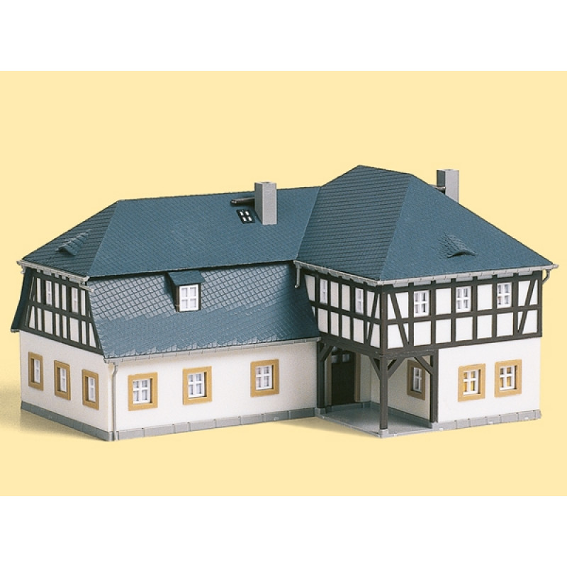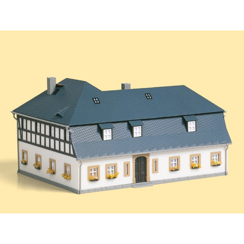 Obytný dům s břidlicovbou střechou a hrázděním ve stěnách. Anténa, vodní pumpa a lavičky jsou přibaleny.