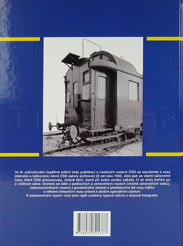 Ve III. pokračování úspěšné ediční řady publikací o osobních vozech ČSD se seznámíte s vozy jídelními a lůžkovými, které ČSD začaly pořizovat již od roku 1945, dále pak se všemi salonními vozy, které ČSD provozovaly, včetně těch, které při svém vzniku zdědily či se staly kořistí po 2. světové válce.