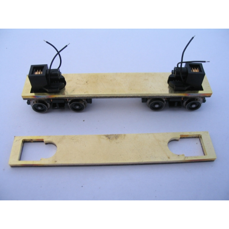 Mosazný rám vypálený z mosazného plechu tloušťky 3 mm, určený pro stavebnice lokomotiv řady T 444.1 (Karkulka) z produkce DK model. Je navržen pro použití podvozků z lokomotivy V 100 od firmy Tillig (zde v naší nabídce). Při jeho použití vznikne těžký pojezd s výbornými jízdními vlastnostmi. Na snímku jsou vidět již nasazené podvozky bez masek a šnekové převody. Po zkrácení lze použít i do lokomotivy T 444.0 (725).