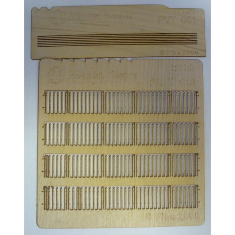 Dřevěné ploty jsou laserem vypalované z dřevěné dýhy, což umožňuje zachycení i velmi precizních detailů. Součástí balení jsou také dřevěné vazníky, které zespodu podlepíte pod aršík plotů a posléze vyříznete hotový plotový díl. Dřevěné ploty jsou vhodné také jako surovina pro další dřevěné stavby, dna vagónů apod.