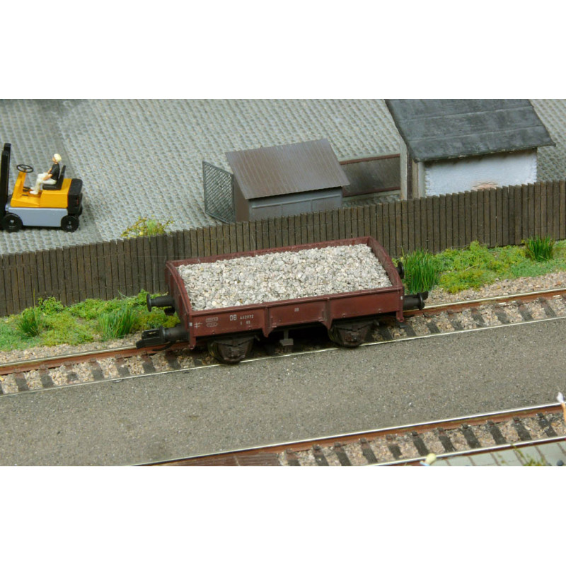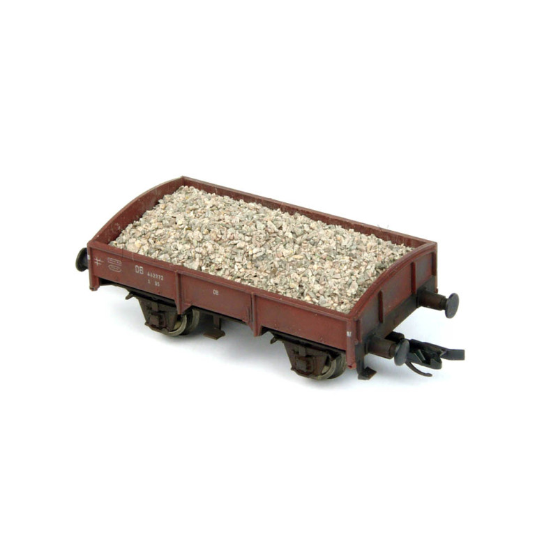 Náklad štěrku do vozů X PMT. Vyrobeno z pravého štěrku. Náklad ve vozech drží pevně, nevypadává, ale lze jej kdykoli vyjmout opatrným zasunutím např. špendlíku mezi náklad a bočnici vozu a vypáčit ven.