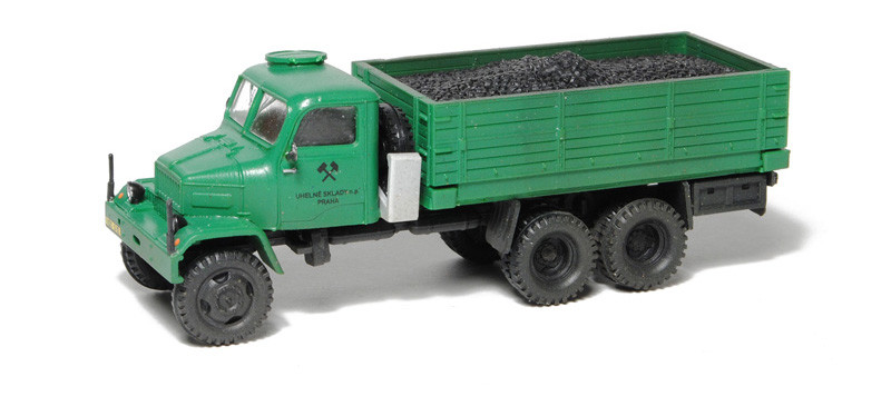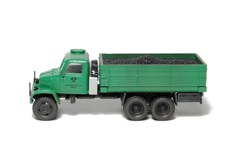 Kompletní plastiková stavebnice valníku – uhelné sklady. Obsahuje probarvené plastikové výlisky na sestavení modelu, kovové osičky a sadu obtisků.