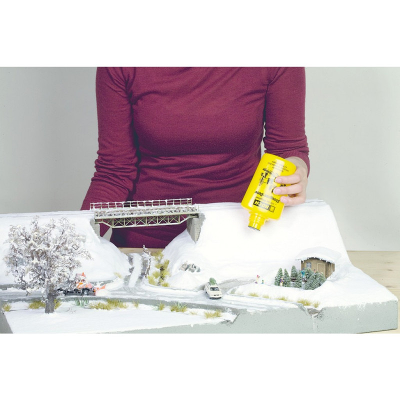 Aplikace: Terén se potře sněhovým lepidlem, poté naplníme elektostaticku nádobku sněhovými vločkami (asi do poloviny objemu), několikerým protřepáním posyp elektrostaticky nabijeme a pak jen opakovaným stisknutím nádobky sypeme (vyfukujeme) vločky do lepidla.