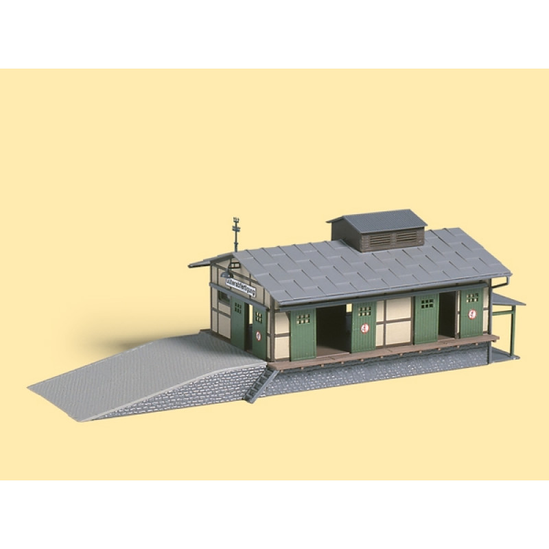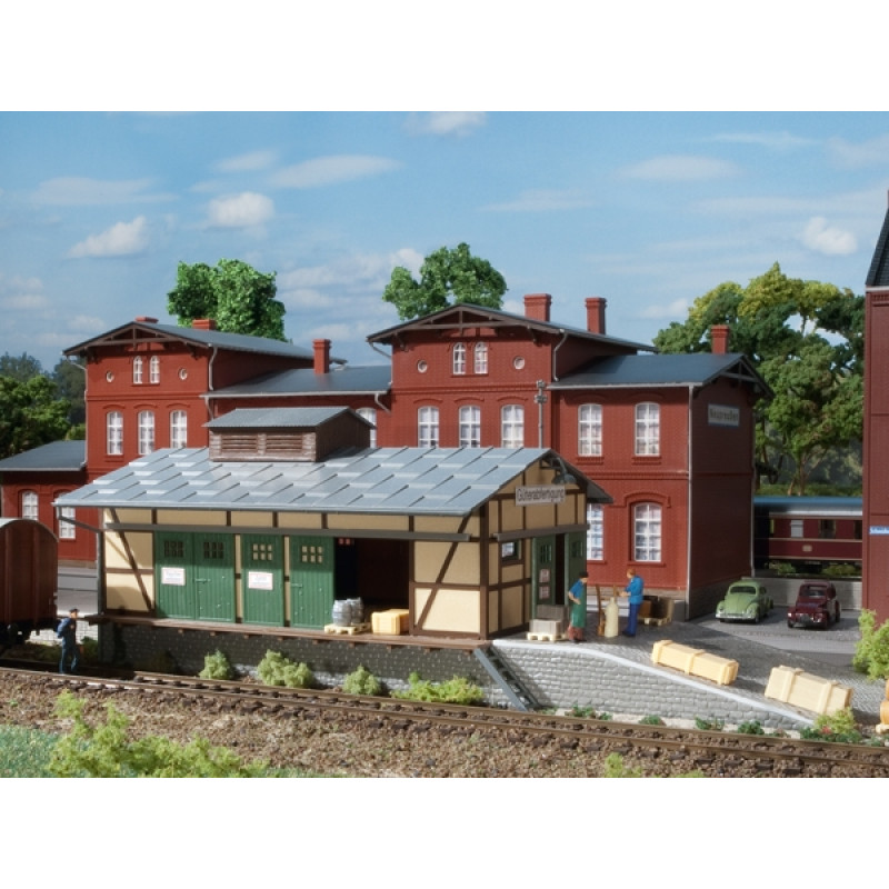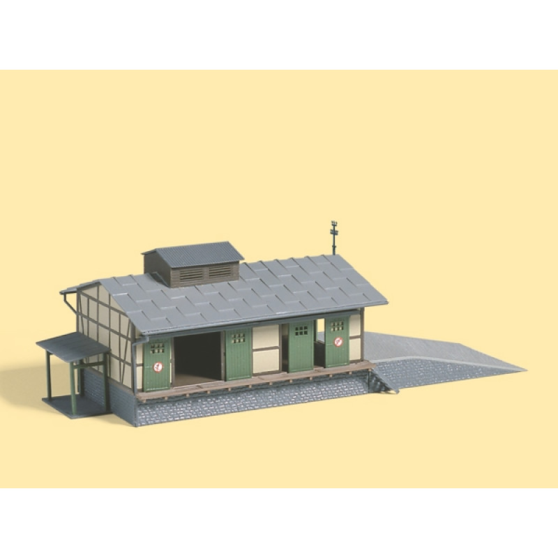 Skladiště s plechovou střechou. Rampy a vrata jsou po obou stranách, k silnici i ke koleji. Vrata jsou navíc funkční. Kombinací dvou těchto produktů lze postavit velké skladiště.