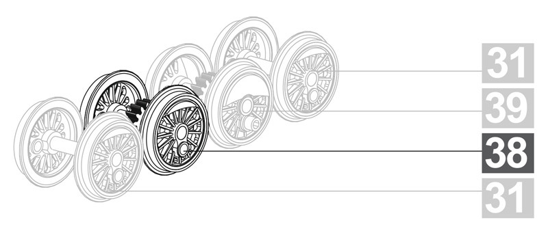 Druhé spřažené dvojkolí pro lokomotivu řady 86, červené, s bandáží, díl č. 38.