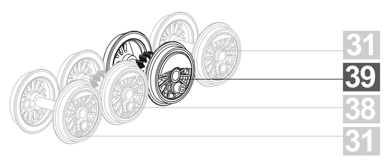 Třetí spřažené dvojkolí pro lokomotivu řady 86, červené, s bandáží, díl č. 39.