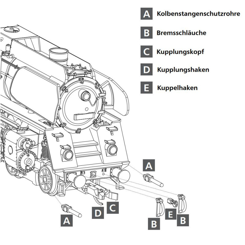 Náhradní dosazovací díly pro samotnou lokomotivu BR 01 Tillig. Pro tender naleznete díly pod číslem 202369.