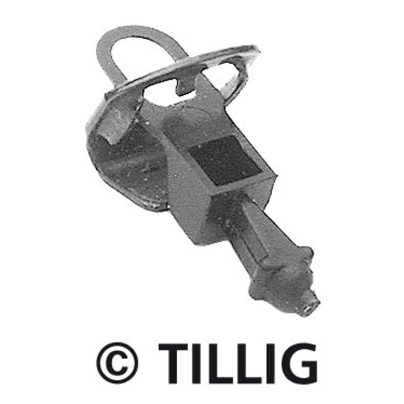Očkové spřáhlo Tillig, dříve využívané na novějších modelech BTTB z konce 80. let. Spřáhlo je upevněno v domečku, v němž je i pružina vracející jej do středové polohy. Používalo se např. na vozech Res, Eas nebo na 3osých Old Timer vozech.