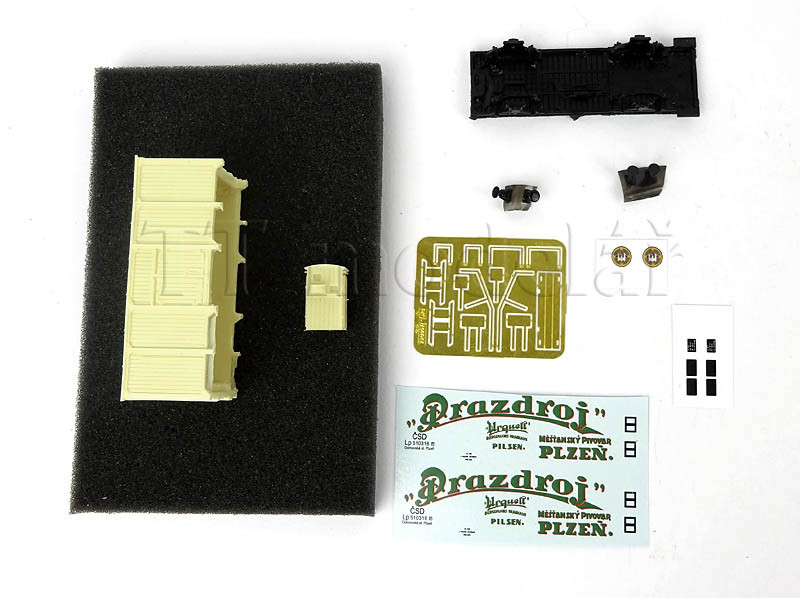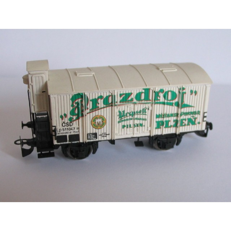 Stavebnice dvounápravového chladícího vozu z rezinu + obtisk s příslušným nápisem: Prazdroj měšťanský pivovar Plzeň, Urquell Pilsen.