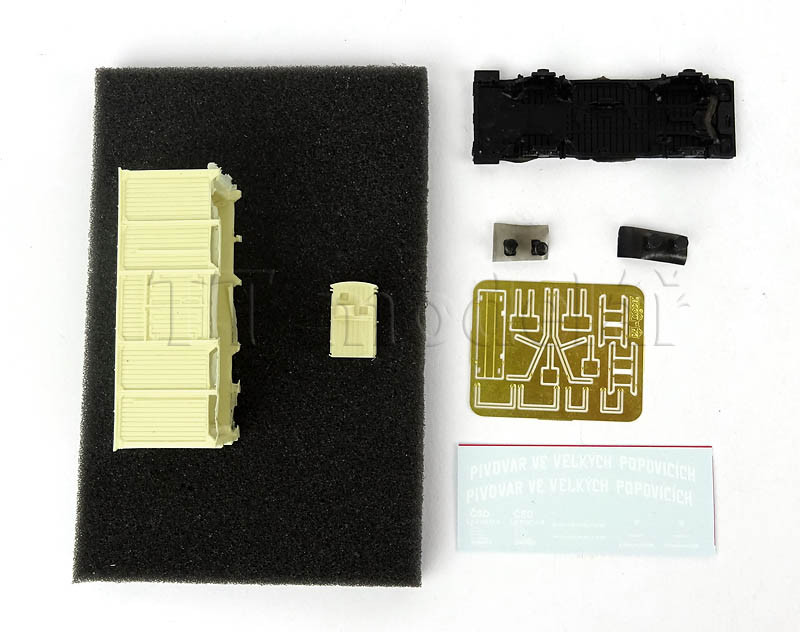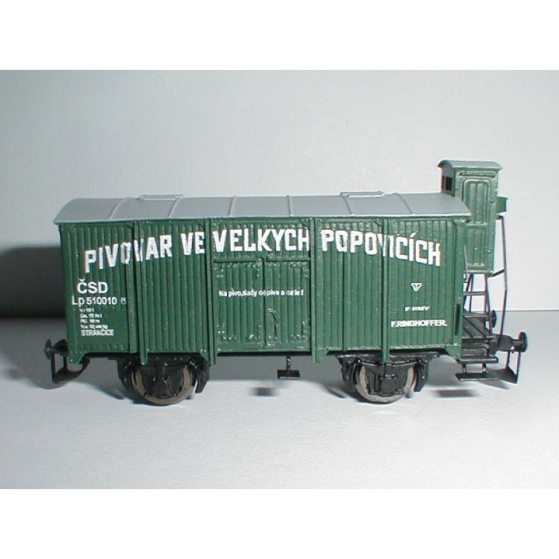 Stavebnice dvounápravového chladícího vozu z rezinu + obtisk s příslušným nápisem: Pivovar ve Velkých Popovicích.