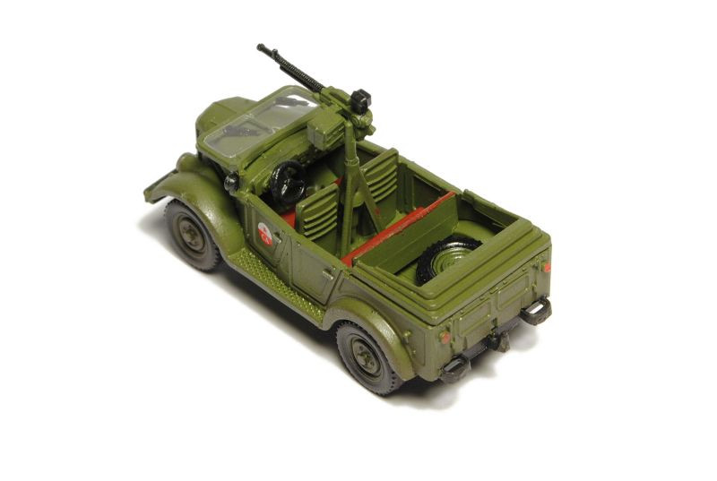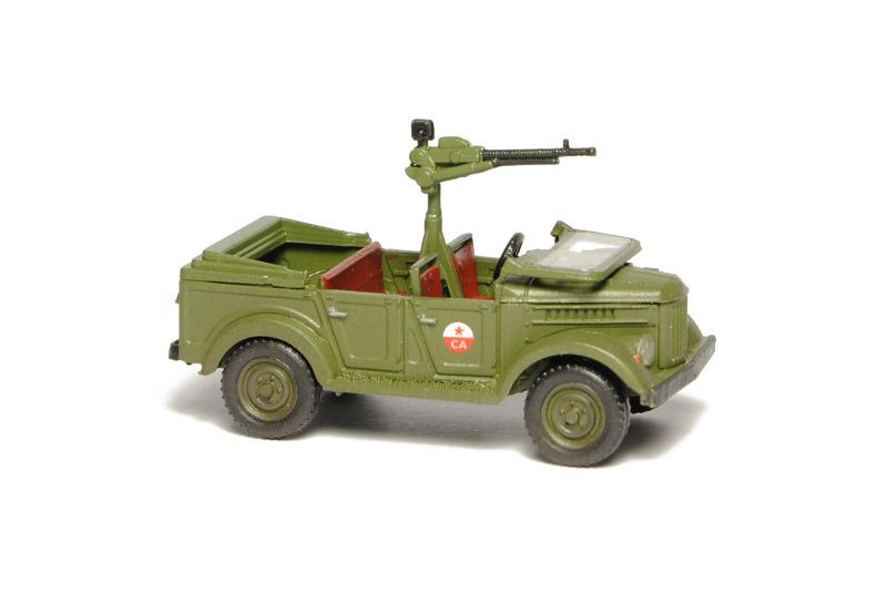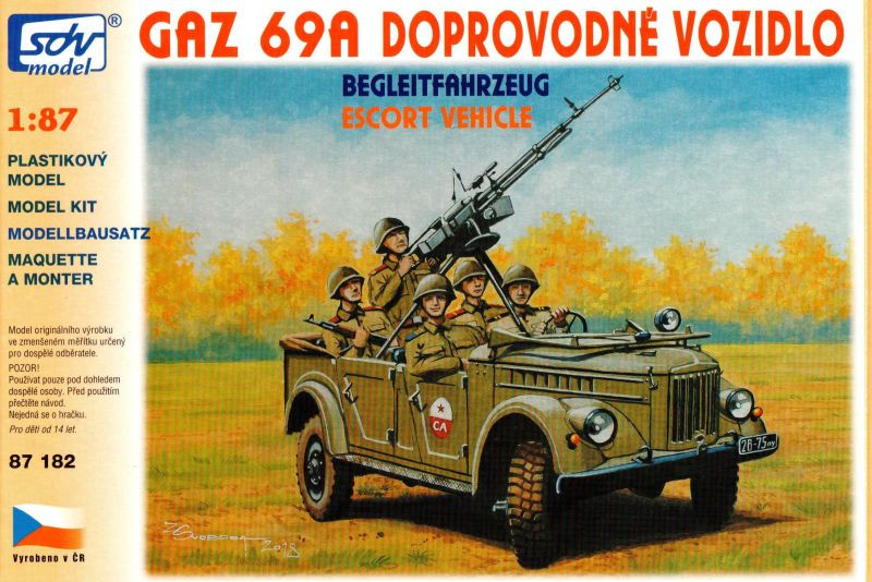 Kompletní plastiková stavebnice lehkého terénního doprovodného vozidla. Obsahuje probarvené plastikové výlisky na sestavení modelu, kovové osičky a sadu obtisků.