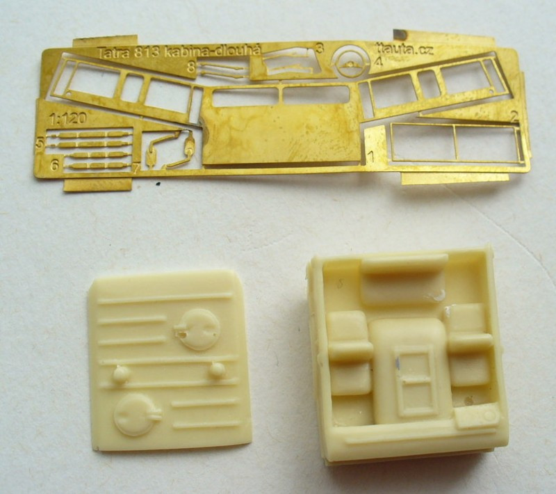 Stavebnice kabiny vozidla Tatra 813 z resinu (spodní díl) a leptu (vršek). Výsledný model má tedy volnou kabinu s naznačeným vybavením.