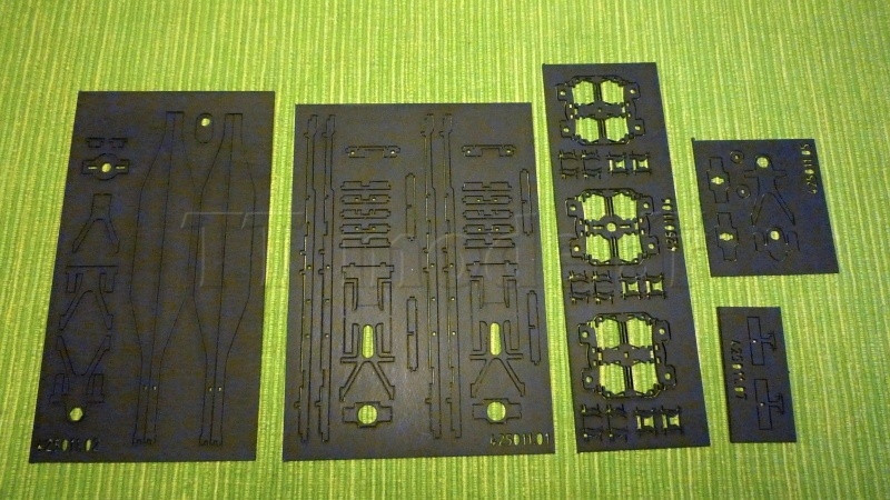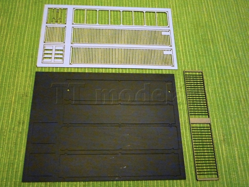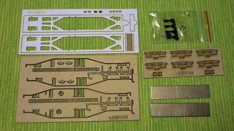 Obsahem stavebnice jsou laserem vyřezávané díly z černého tvrzeného polystyrenu pro sestavení podvozků a rámu vozu, doplněné dalšími díly ze silnějšího a slabého kartonu (podlaha vozu, zesílení po obvodu rámu, žebříky, plasticky vytvarované masky podvozků a ložiskové domky atd.). V balení jsou i plastové nárazníky, mosazná ložiska dvojkolí, díky kterým má model skvělé jízdní vlastnosti, a závaží z ocelového plechu.