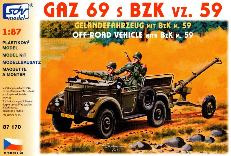 Kompletní plastiková stavebnice lehkého terénního vozu s bezzákluzovým kanonem. Obsahuje probarvené plastikové výlisky na sestavení modelu, kovové osičky a sadu obtisků.