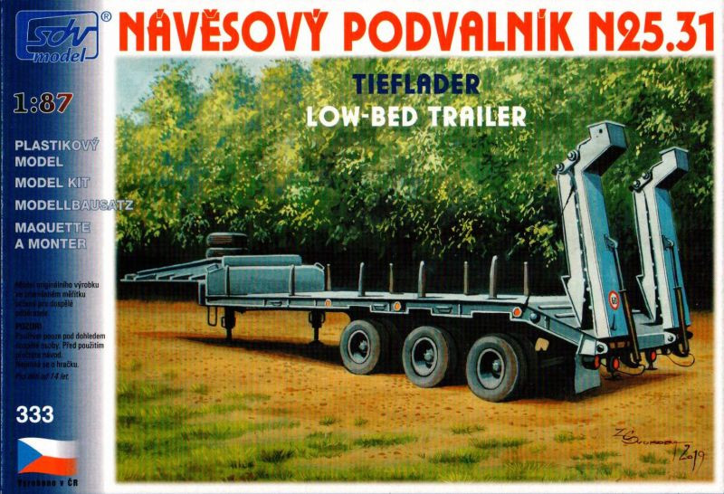 Kompletní plastiková stavebnice návěsového podvalníku. Obsahuje probarvené plastikové výlisky na sestavení modelu, kovové osičky a sadu obtisků.
