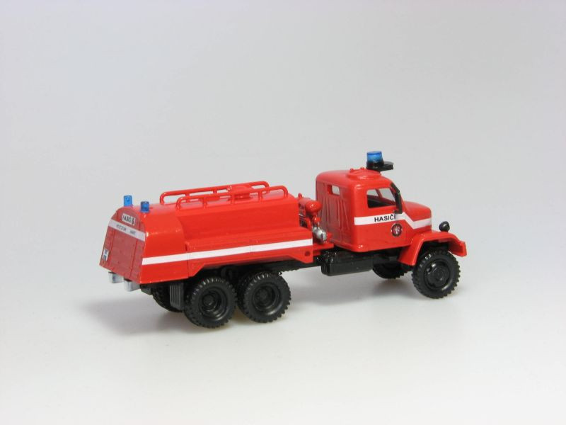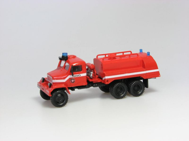 Hasičská cisterna SDH Kryštofovy Hamry. Stavebnice obsahuje plastikové výlisky, majáky, sadu SPZ, sadu obtisků a nově také kovové osičky.