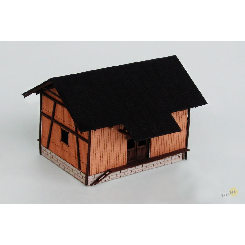 Model skladiště bez rampy vyrobený technologií Laser-Cut. Základem je lepenka, na kterou se lepí probarvený karton a díly ze dřeva. Počet dílů: 35. Model je dodáván jako stavebnice a její sestavení trvá cca 2 hodiny.