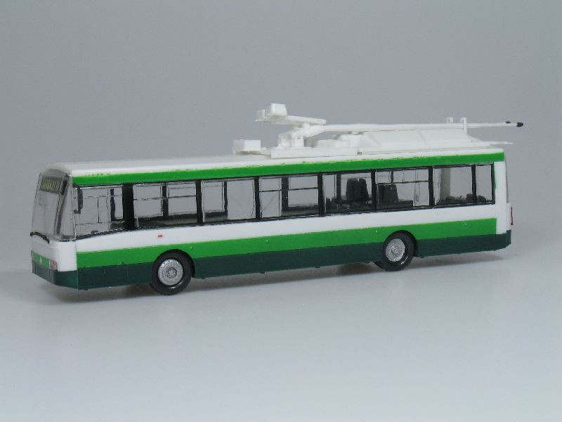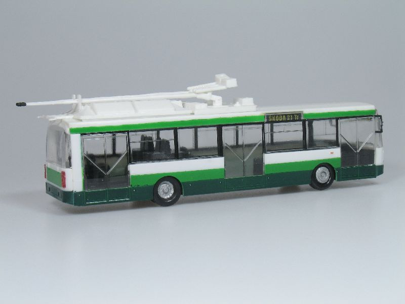 Trolejbus DP Plzeň. Stavebnice obsahuje probarvené plastikové výlisky, obtisky a potištěná boční skla. Stavebnice je od 20.11.2015 dodávána s novými koly, novými disky a kovovými osičkami.