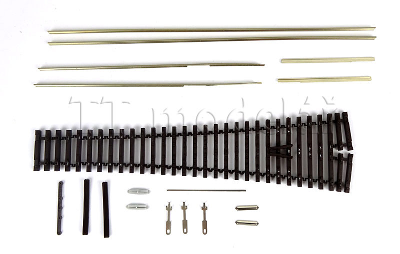 Stavebnice FBW (flexi výhybky) s úhlem odbočení 15 stupňů (jako EW2). Tuto výhybku lze díky flexi pražcovému roštu natvarovat do symetrické výhybky (ABW), klasické pravé nebo levé výhybky (EW2 R či L), obloukové výhybky (IBW) s poloměrem dle libosti. Obsah sáčku je vidět na snímku. Sestavení již vyžaduje určité zkušenosti, je vhodné mít vzor v podobě hotové tovární výhybky. Jednoduchá výhybka EW 2 má délku 166 mm, úhel odbočení 15 stupňů, poloměr odbočení 631 mm. Jazyky jsou již provedeny z jednoho kusu, jsou tedy pružné, modelové a odolné. Jako přestavník není možné použít elmag přestavníky! Pouze motorické, případně jiné, zabezpečující stálé napružení v obou krajních polohách. Srdcovka je modelově zpracována z kolejnicového prutu a je tedy el. oddělena od navazujících kolejí pomocí izolačních spojek, které jsou součástí výhybky, a její polaritu je třeba zvlášť přepínat přepínačem spřaženým s přestavníkem (motorický přestavník 86110 toto má již zabudováno, podobně jako mnoho dalších typů).
