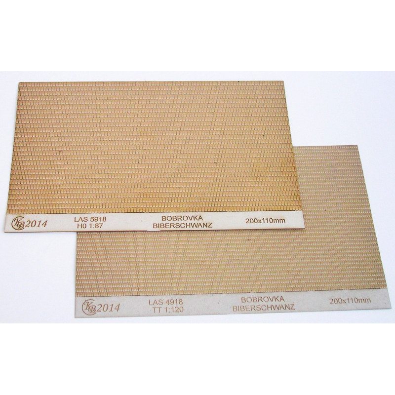 Tašky bobrovky pro modelovou velikost H0 1:87 řezané přesnou technologií laser-cut ve 3D v ploše 200x110mm. Střešní krytina je vhodná pro individuální stavbu modelu budovy nejen pro železniční modeláře, ale i pro stavbu diorámat, architektonické modely apod., třeba i pro papírové modeláře jako upgrade jejich modelů budov. Karton lze po aplikaci zafixovat nástřikem bezbarvého laku a poté barvit a lze aplikovat práškové patinátory.