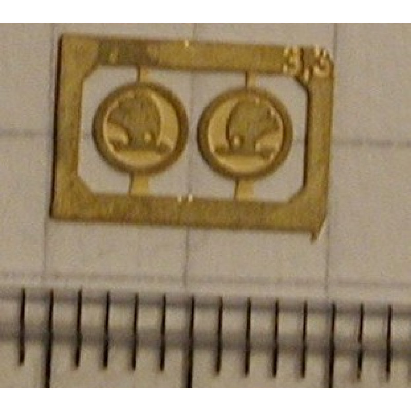 Lept se dvěma kusy továrních znaků naší známé lokomotivky Škoda Plzeň, průměr 3,3 mm. Například na usměrňovače kouře parních lokomotiv- pravý a levý.