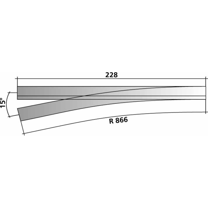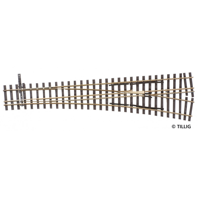 Tříkolejnicová výhybka úzkorozchodné tratě, pravá, H0/H0m, úhel 15°, R 866 mm, délka 228 mm. Odbočuje normální rozchod.
