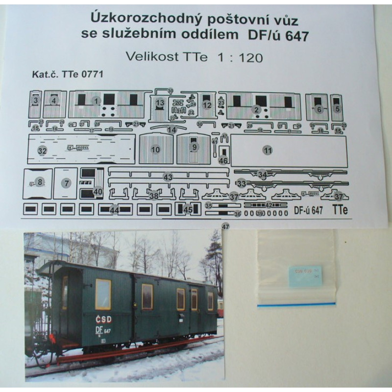 Stavebnice - Úzkorozchodný poštovní vůz se služebním oddílem DF/ú 647, TTe, DK model TTe0771