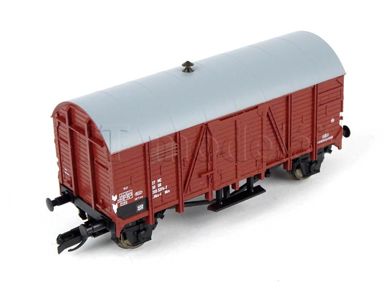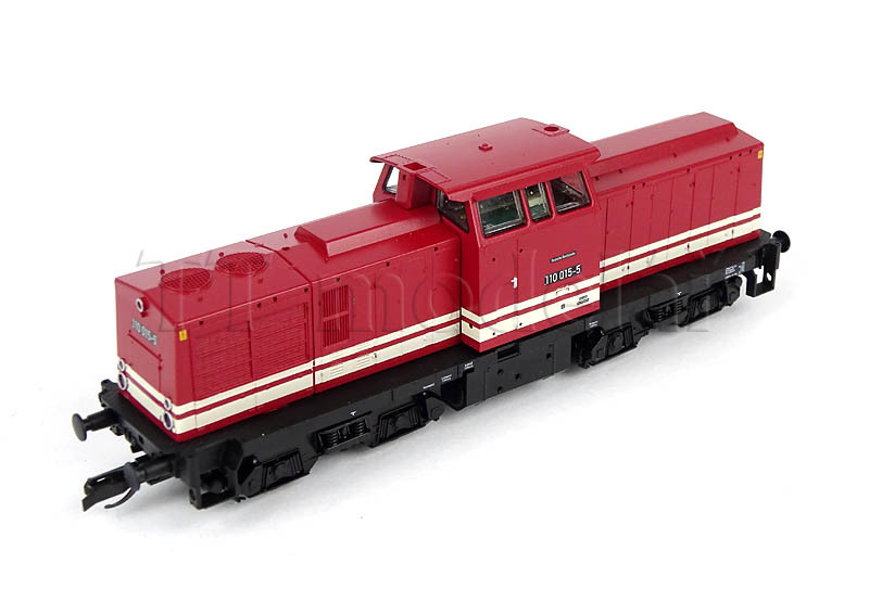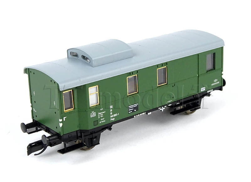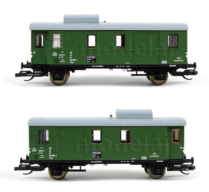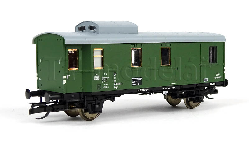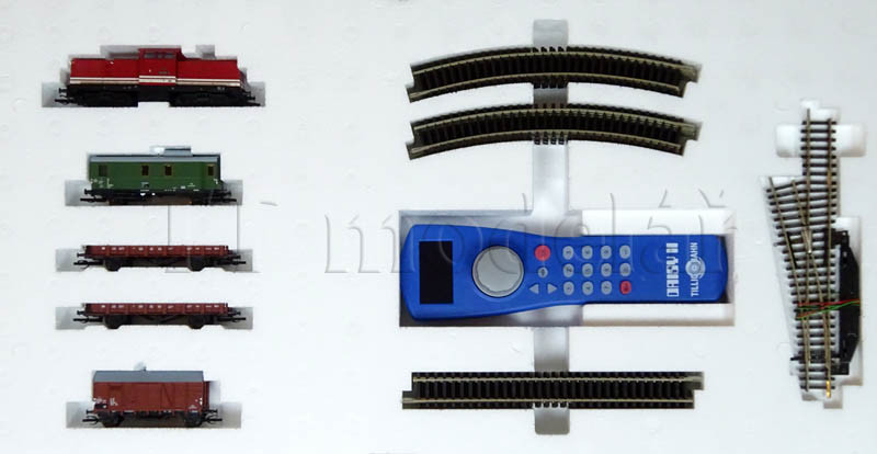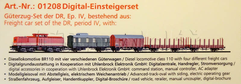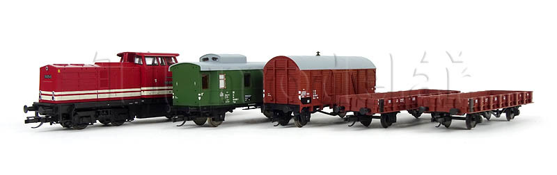 soupravu nákladního vlaku DR ze IV. epochy (motorová lokomotiva řady BR 110 s digitálním dekodérem, služební vůz, uzavřený vůz, 2 x nízkostěnný vůz s klanicemi),