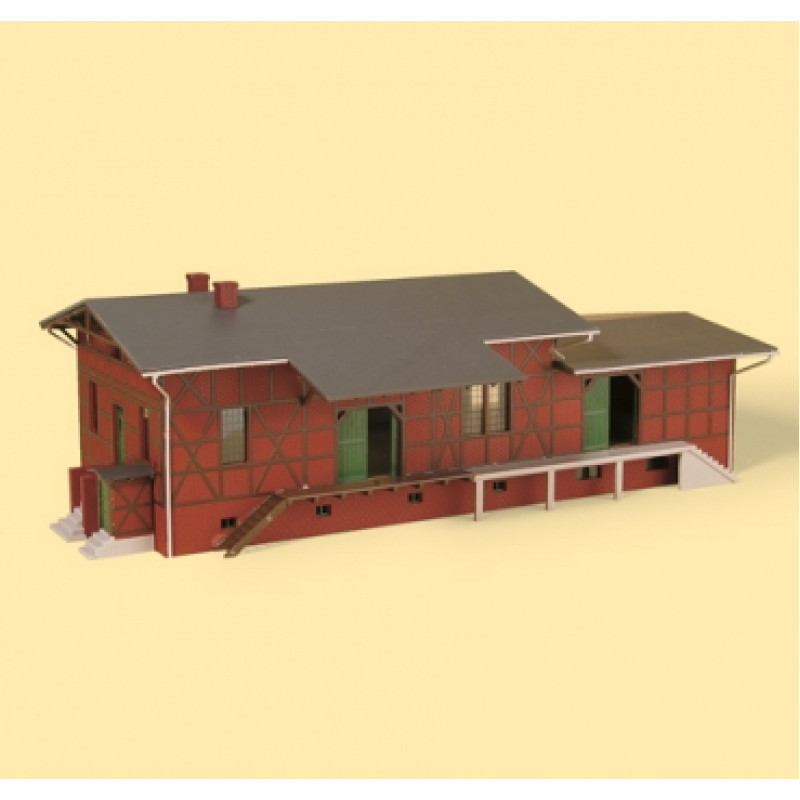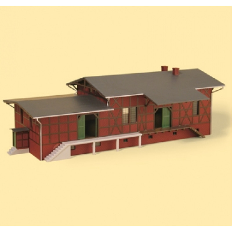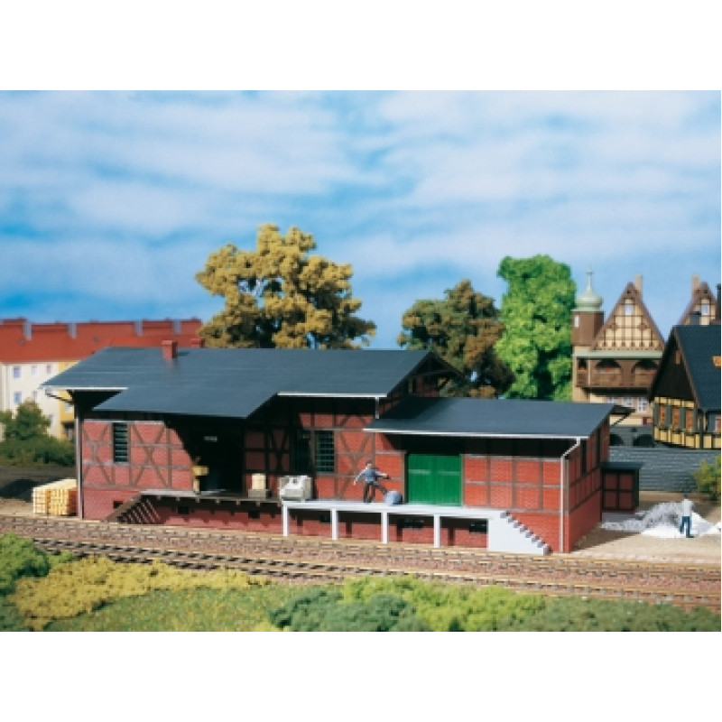Zděné skladiště s hrázděním. Vhodné ke stanici Klasdorf, kat. č. 13299. Otvíratelné dveře. Při použití kolejí s podložím je nutno upravit výšku základny.